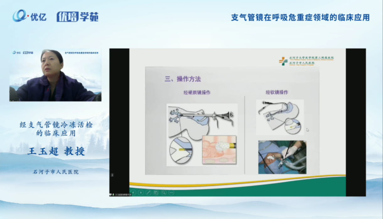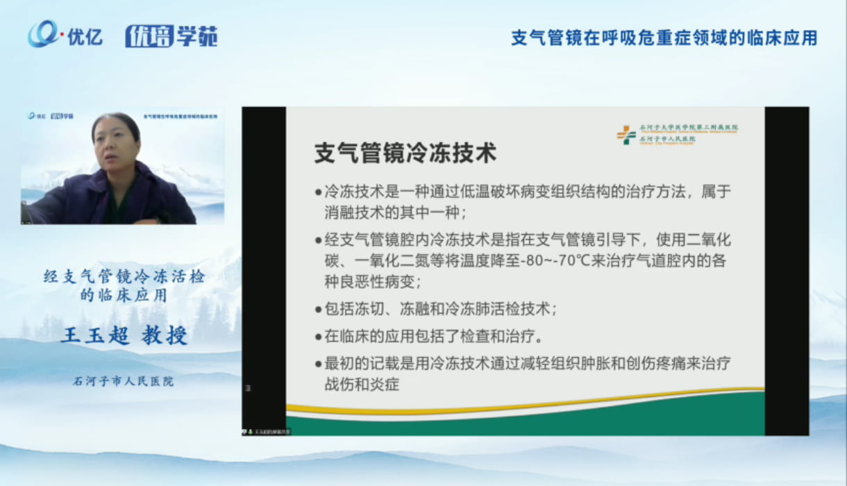 王玉超教授分享了支气管镜冷冻技术、冷冻低温作业原理、冷冻的作用机制、冷冻效果影响因素、冷冻治疗的优势、冻融操作方法、经支气管镜冷冻肺活检的概念、TBCB的特点、适应症、禁忌症、并发症及处理等内容。