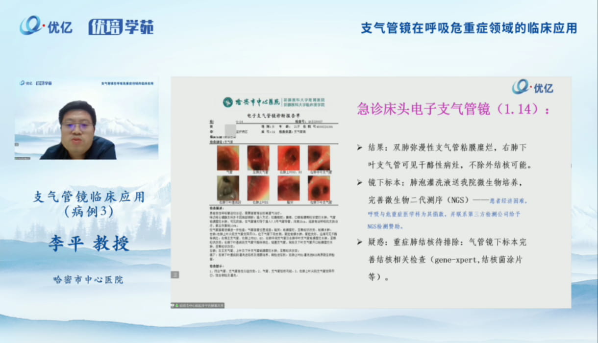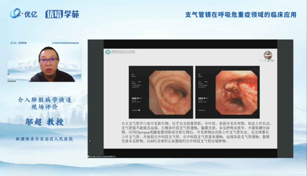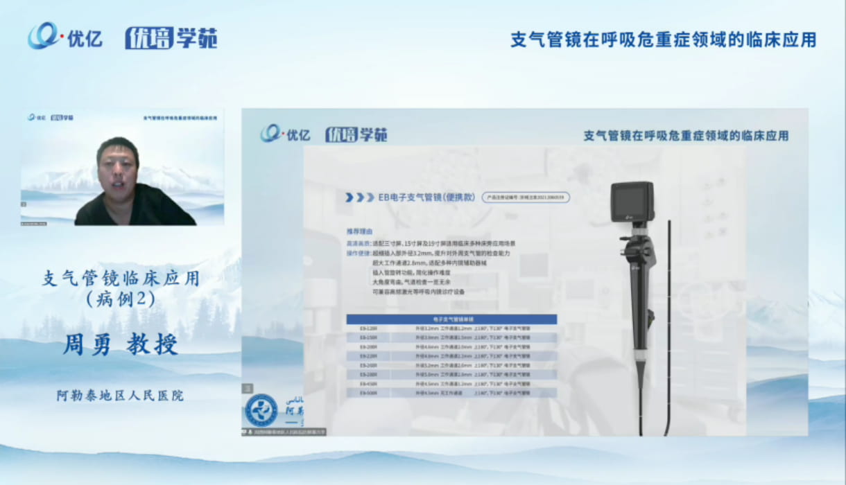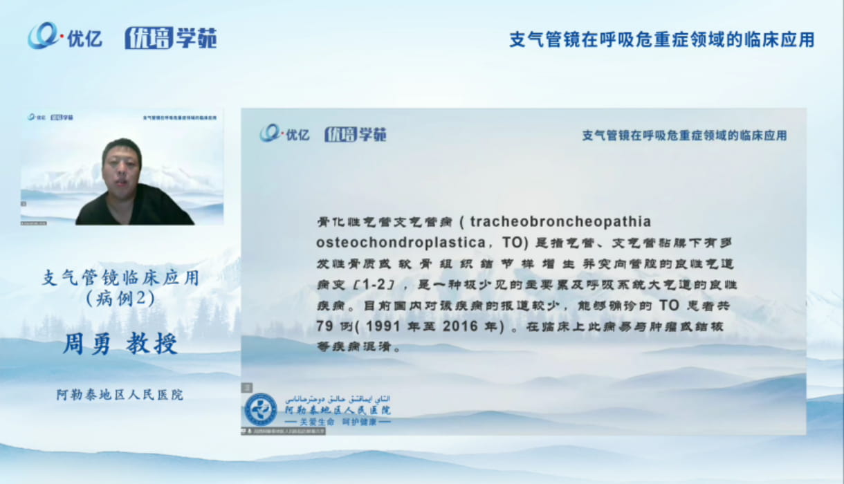周勇教授分享了支气管镜在重症肺炎患者中的应用、支气管镜在气管异物中的应用、支气管镜在罕见病的应用、支气管镜在纤维素性支气管炎的患者中应用等四个案例内容。