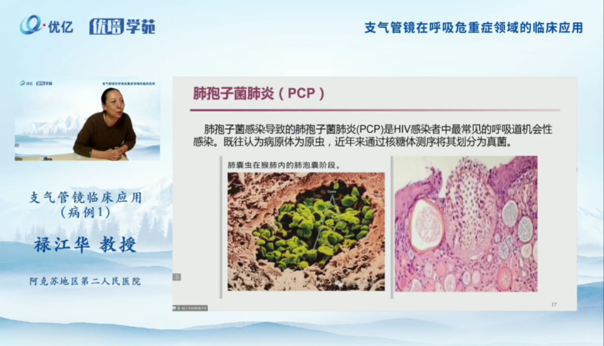 禄江华教授分享了两例临床病例同时延伸介绍了PCP病原学特点、PCP影像学特点、PCP临床特点及治疗等内容。