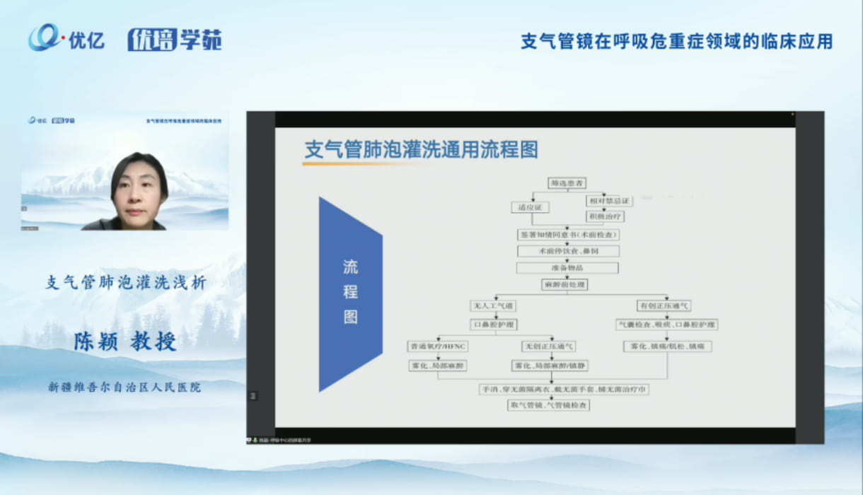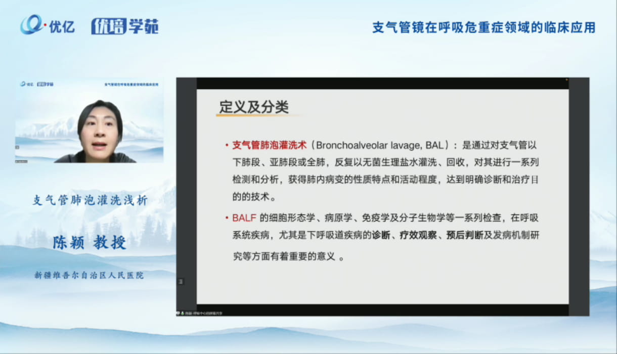 陈颖教授分享了支气管肺泡灌洗术的定义及分类、适用范围与用途、病原检验目的、适应症及禁忌症、围操作期的工作、灌洗的操作流程、并发症及其处理、BALF处理及解读等内容。