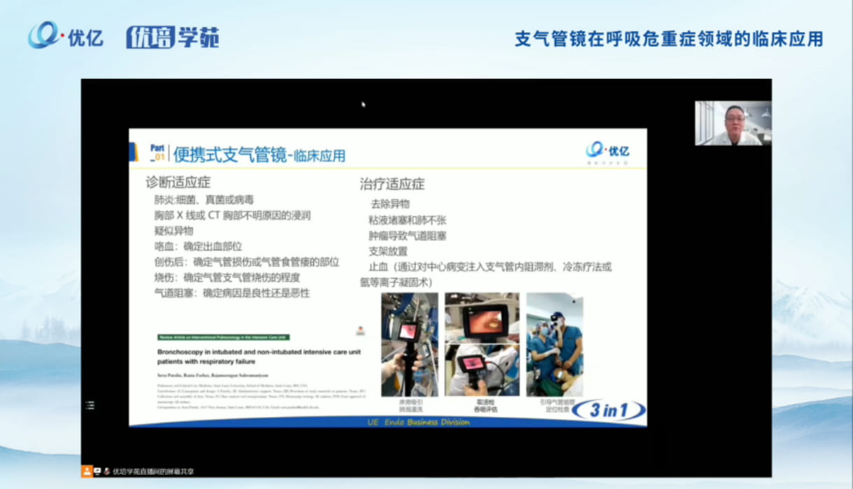 2022年11月18日,《支气管镜在呼吸危重症领域的临床应用》于线上胜利召开! 随着便携式支气管镜技术上的不断改进,支气管镜被广泛的应用在呼吸科及其他的科室,特别是在急诊科危重患者的抢救及监护治疗中发挥着越来越重要的作用。为加强呼吸领域医生对支气管镜在呼吸急危重症临床应用的了解,特组织 “支气管镜在呼吸危重症领域的临床应用”以期通过知名专家的经验分享,深入探讨支气管镜应用重难点,使支气管镜在呼吸急危重症发挥更大的作用,挽救更多患者的生命。