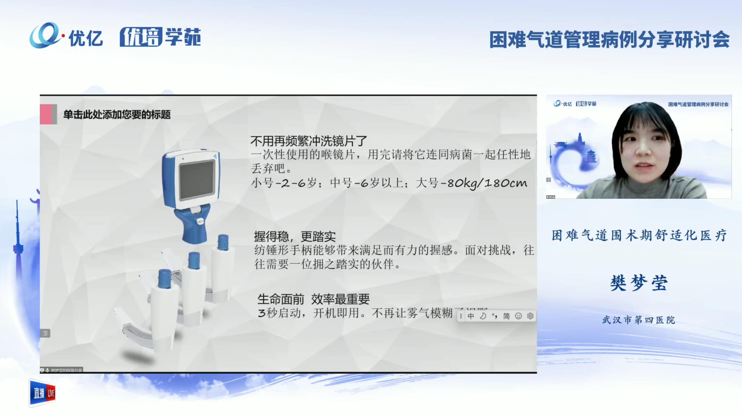 非常高兴能够参加优培学苑举办、武汉市部分麻醉科参与召开的困难气道管理病例分享研讨会。两年前武汉疫情最困难的时候,白雪先生冒着危险,克服了重重困难,在武汉封城期间亲自把医疗物资送到每个医院手上,在今天这个时间,也再次感谢白雪先生组织了这次会议。气道管理是我们麻醉科医生非常重要的一个任务,也是我们的核心技术之一,及时有效的处理气道问题,保证患者气道的通畅和氧合,最大程度的减少风险,是我们麻醉医生的首要任务。